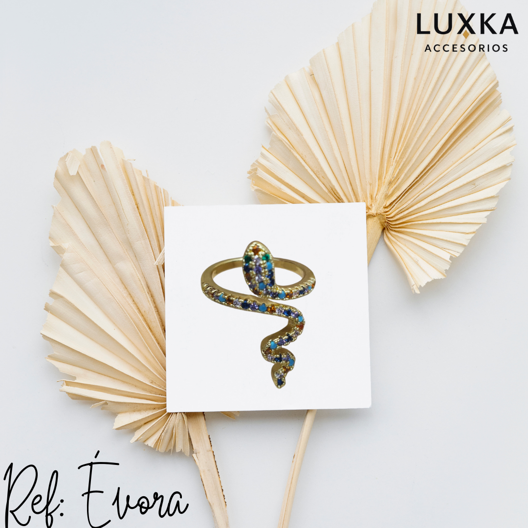 Atrévete a destacar con el anillo Évora , un diseño en forma de serpiente que combina elegancia y poder. Elaborado en acero inoxidable de alta calidad , este anillo resalta con piedras multicolores engastadas que aportan brillo y originalidad a cada movimiento.