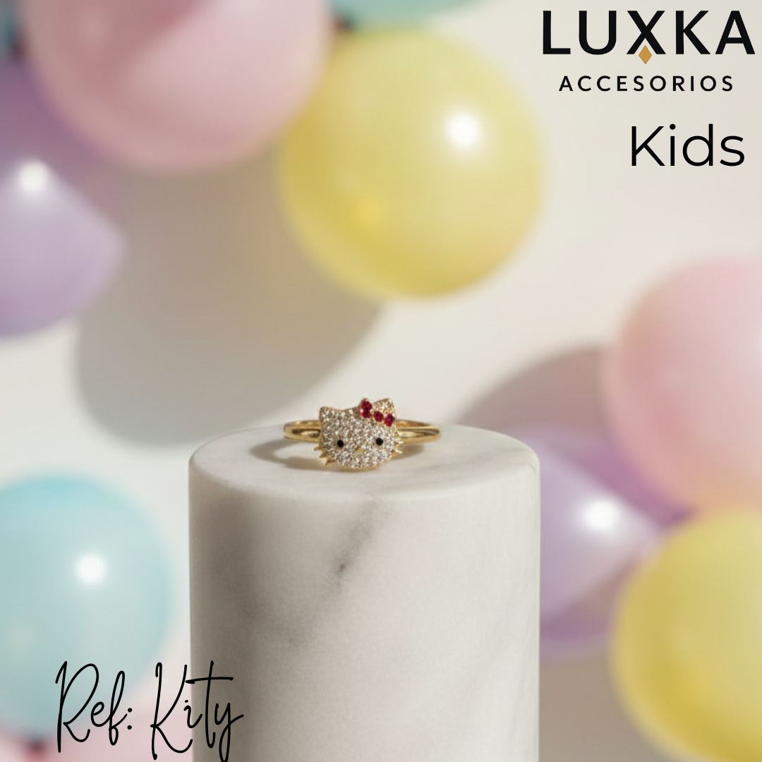 Dulce, brillante y encantador ✨. El anillo dorado infantil de Luxka Accesorios Kids está diseñado para las pequeñas que aman los accesorios llenos de brillo y ternura. Su diseño inspirado en un tierno personaje, adornado con cristales blancos y un lazo rojo, lo convierte en una pieza divertida y elegante al mismo tiempo. 💖
