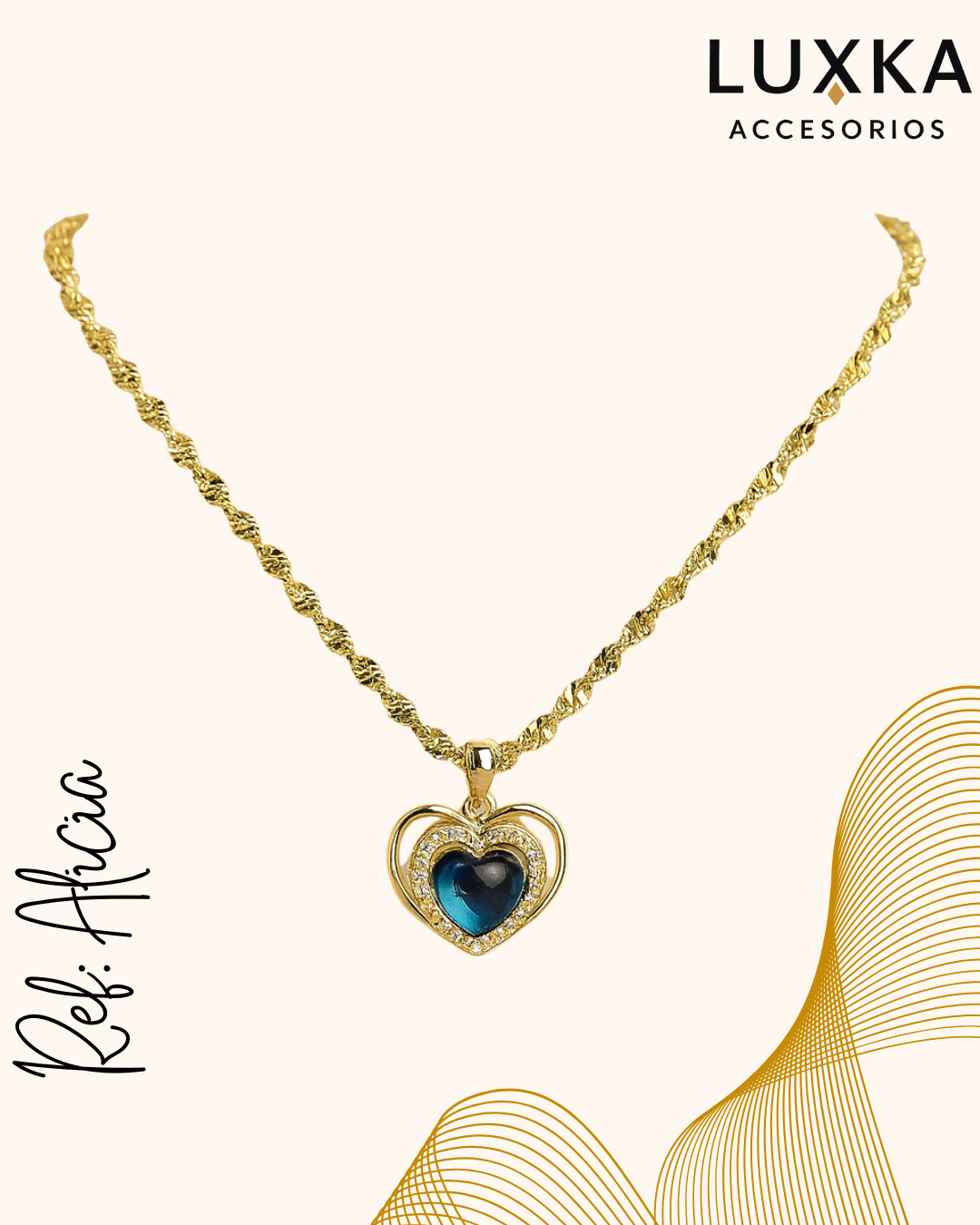 Eleva tu estilo con esta cadena en rodio de alta calidad, un accesorio elegante y versátil que destaca por su durabilidad y brillo impecable. Su diseño incluye un dije en forma de corazón azul profundo, rodeado de un marco dorado con incrustaciones brillantes que aportan un toque romántico y sofisticado a cualquier look.