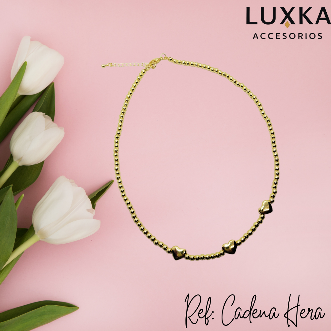 El collar dorado con corazones de Luxka es un accesorio versátil que refleja elegancia y romanticismo. Diseñado en acero inoxidable de alta calidad, combina delicadas cuentas doradas con tres dijes de corazones que lo convierten en una pieza única y moderna.