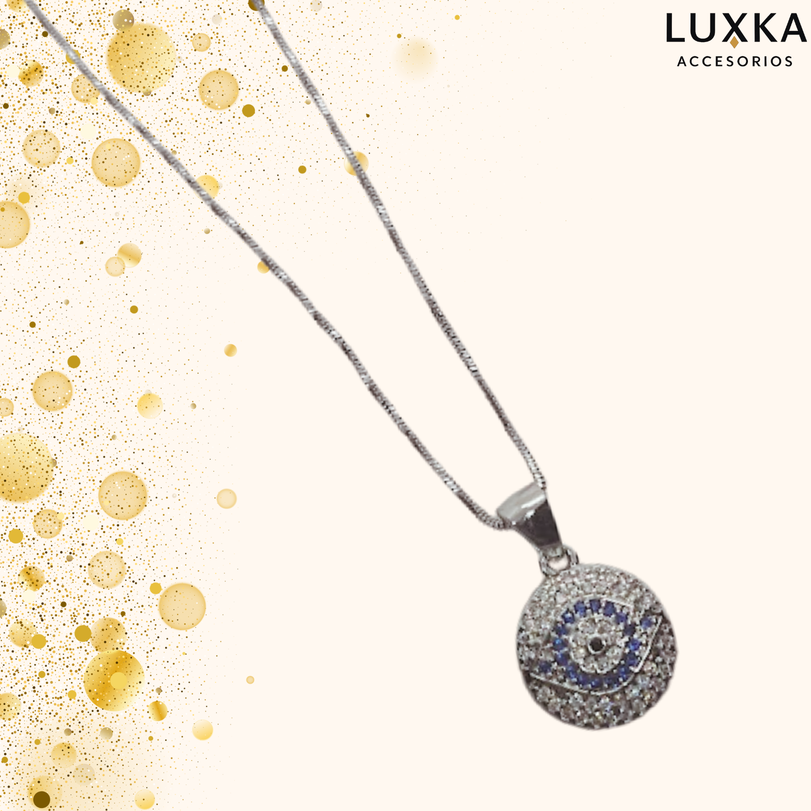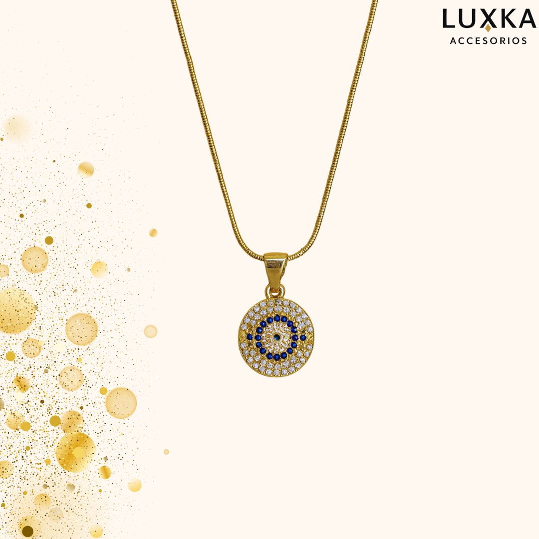 - Diseño: Dije circular con piedras brillantes en tonos plateado y azul (ojo protector).