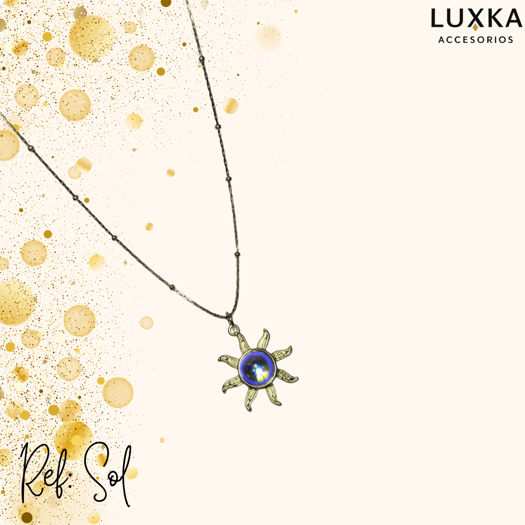 El Collar Sol Dorado de Luxka Accesorios es una joya inspirada en la fuerza, la luz y la vitalidad. Su dije en forma de sol con centro tornasolado refleja destellos únicos que cambian con la luz, creando un efecto moderno y llamativo que eleva cualquier look.