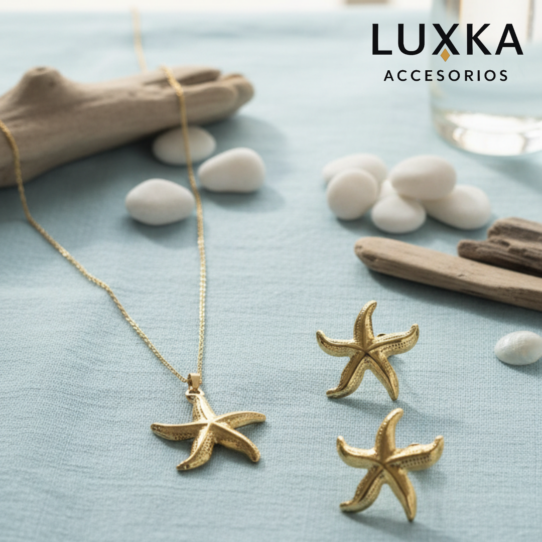 Luce el encanto del mar con el Set Estrella de Mar de Luxka Accesorios, una joya inspirada en la frescura del océano y el brillo dorado del verano. Este hermoso conjunto incluye una cadena y un par de aretes en forma de estrella de mar, perfectos para realzar tu estilo con un toque tropical y sofisticado.