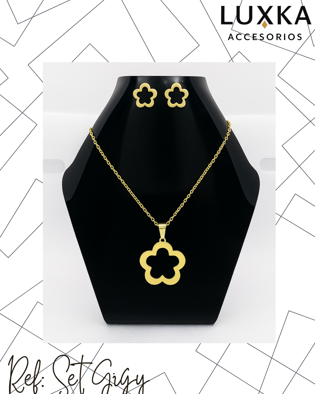 El Set Gigy de Luxka Accesorios combina elegancia y modernidad en un diseño minimalista que resalta la belleza en cada detalle. Fabricado en acero inoxidable de alta calidad, este set incluye un collar con dije en forma de flor y unos aretes a juego, ambos con un acabado dorado brillante que no se oxida ni pierde color.