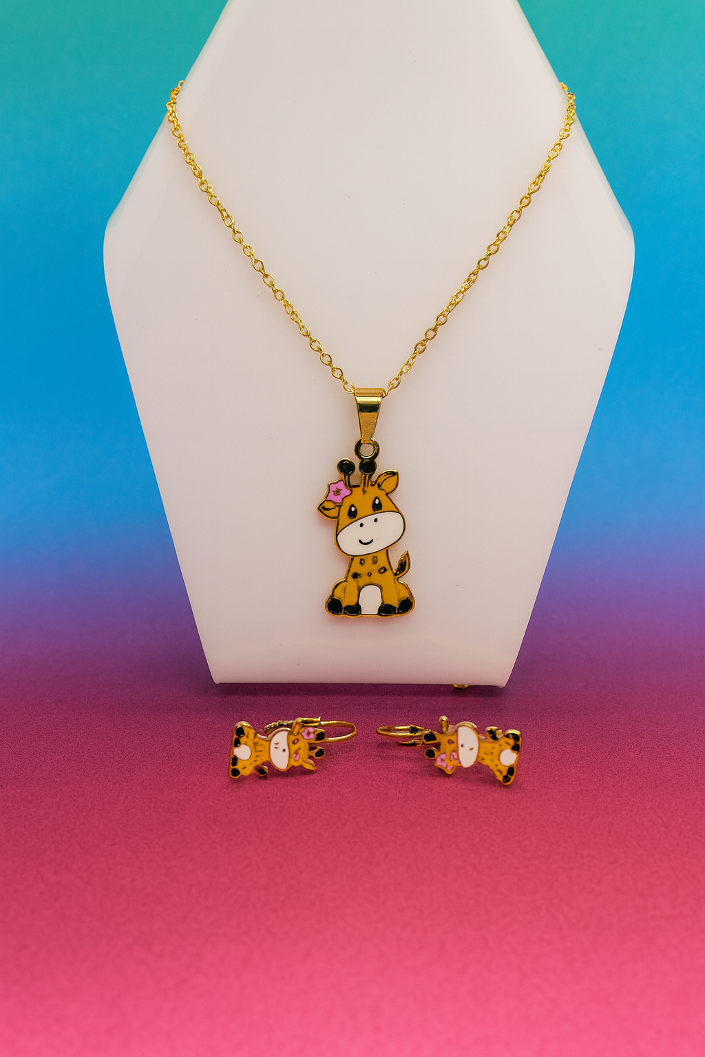 Dale un toque de ternura y diversión a cada look con este set infantil de collar y aretes en acero inoxidable, diseñado con un encantador dije de jirafa. Su acabado dorado y esmaltado en tonos vivos lo hacen ideal para niñas que aman los accesorios coloridos y llenos de personalidad.