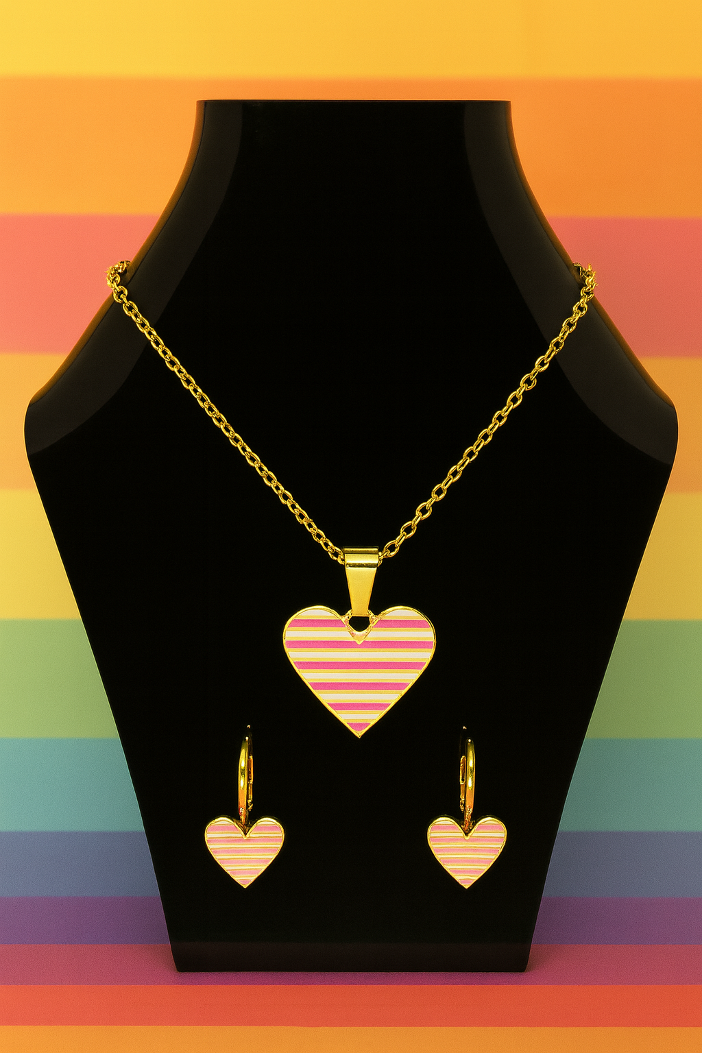 Set Kyra – Cadena y Aretes en Acero Inoxidable con Corazón a Rayas